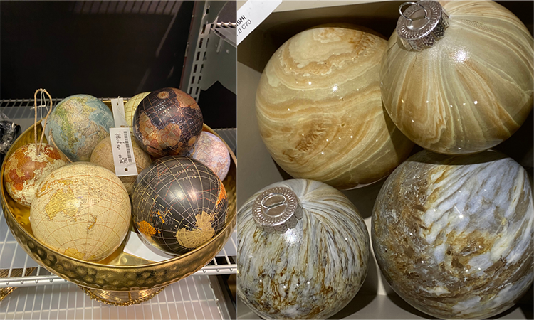 使该主题趋势更接近家居,装饰具有更柔和的自然感觉——颜色和图案可以直接“抄袭”地球表面,并“引进”其他自然材料,如纸质球体、景色木雕、圣诞树装饰球(看起来像是磨光的岩石碎片)。